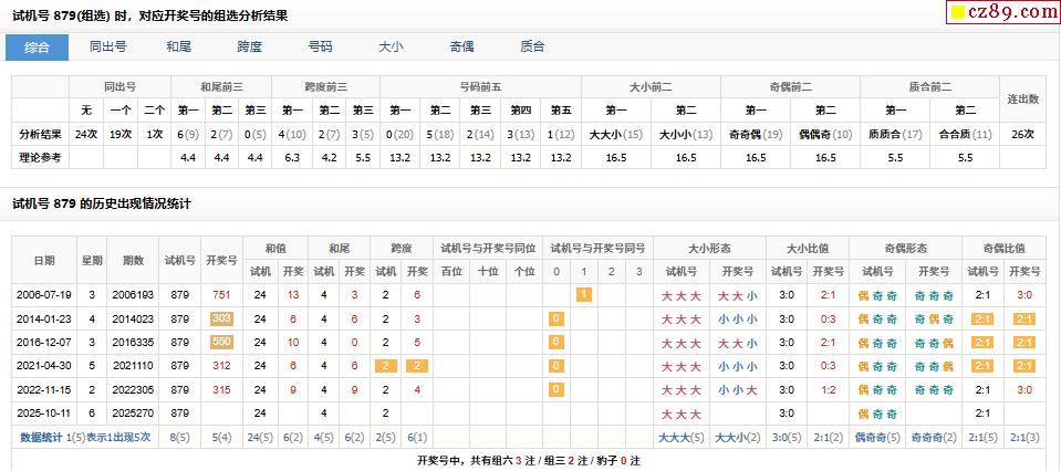 > 270期福彩3D试机号879对应开奖号的组选分析结果